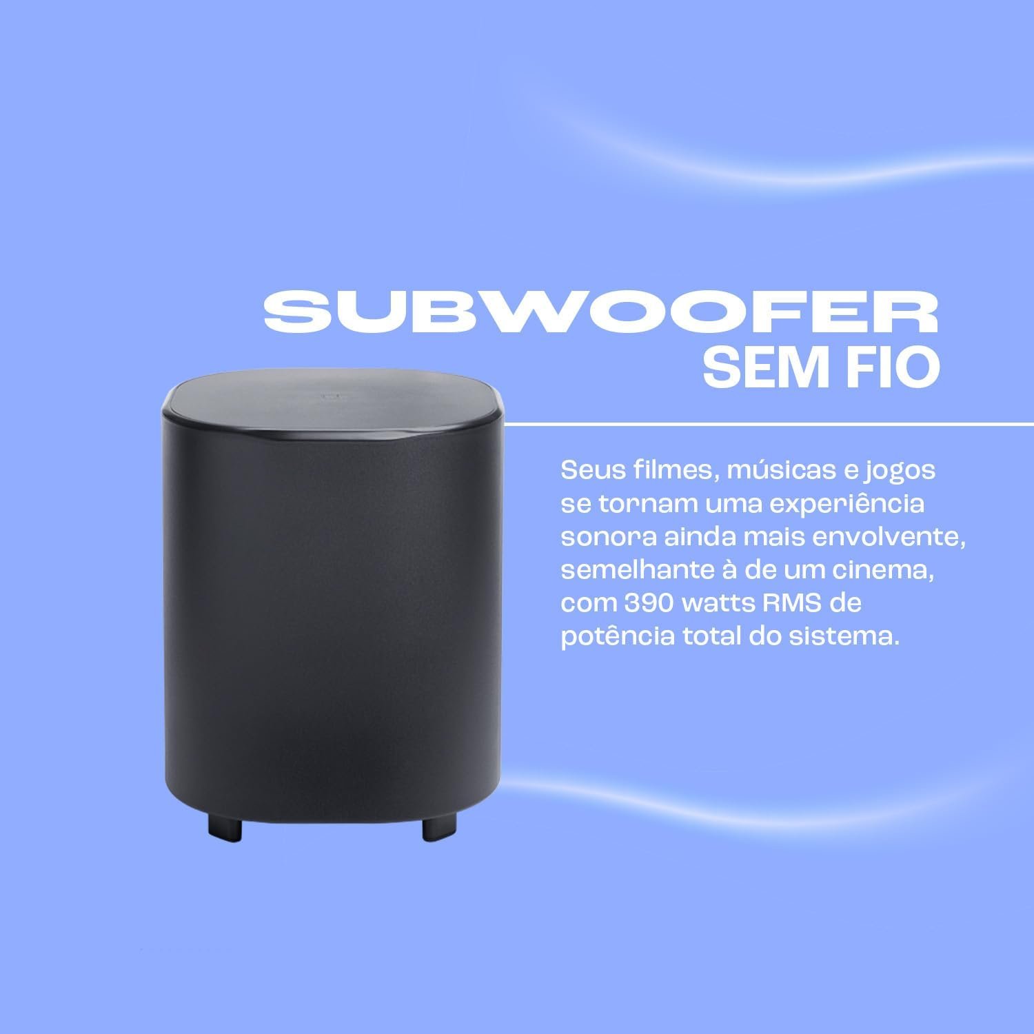 POTÊNCIA IMPRESSIONANTE. 390 W RMS combinados com subwoofer sem fio de 10″ para graves fortes e som impactante em filmes, músicas e jogos.