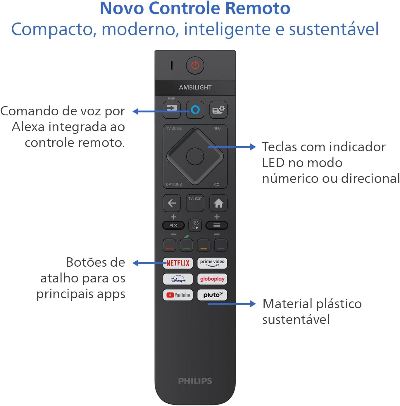 O que inclui: 1 Smart TV Philips 55″, 1 controle remoto, 2 pilhas AAA, cabo de energia, guia de início rápido, folheto legal e de segurança, suporte para mesa e 1 ano de garantia.