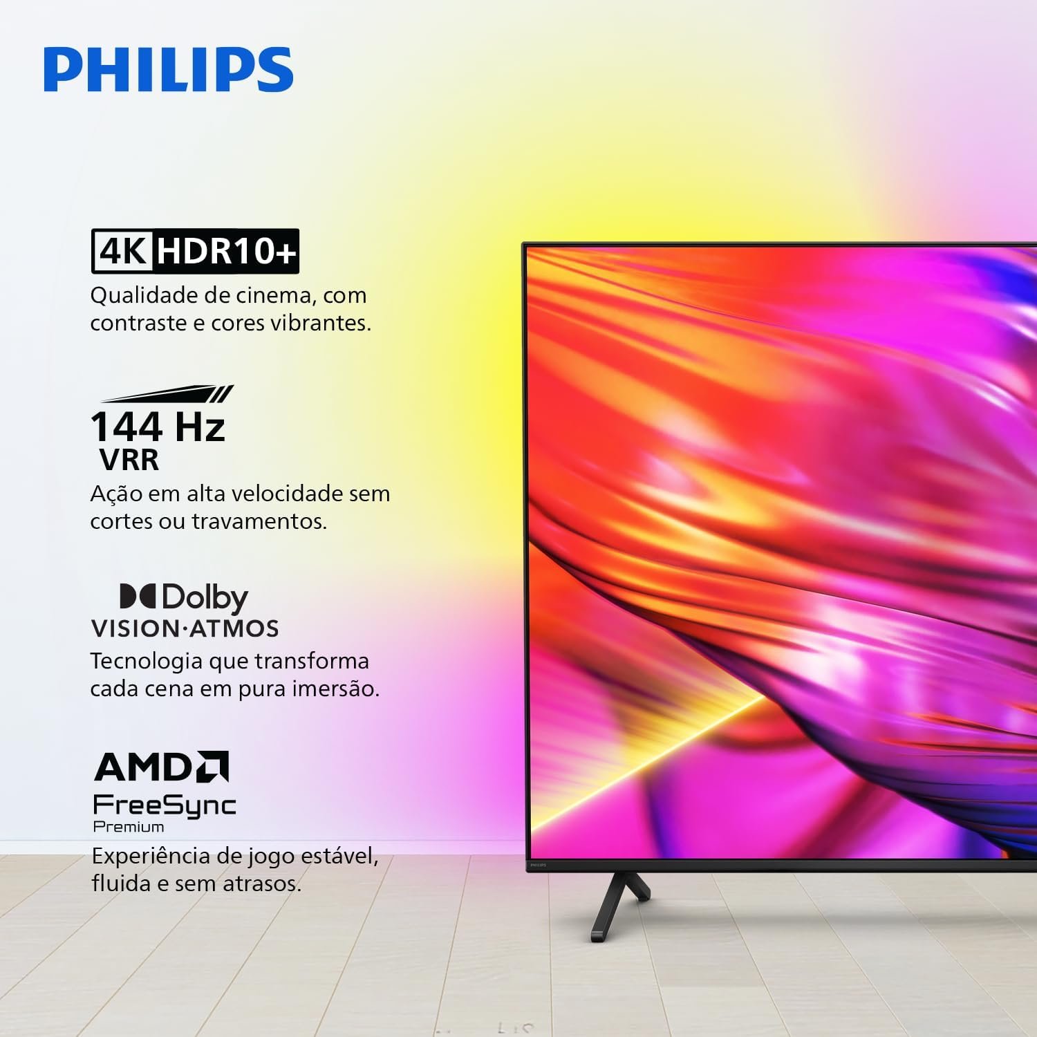 Conheça a Smart TV Philips THE ONE 55″ 55PUG8929/78, a TV que tem tudo para elevar sua experiência de entretenimento. A exclusiva tecnologia Ambilight projeta as cores da tela na parede, criando um espetáculo de luzes que amplia a imersão em filmes e jogos. O poderoso processador P5 e a tecnologia Dolby Vision garantem imagens com brilho e contraste impressionantes. Para os gamers, a TV entrega fluidez total com taxa de atualização de 144Hz VRR, AMD FreeSync Premium e Game Bar. O áudio também é destaque com o sistema de som de 40W RMS, Dolby Atmos e DTS Play-Fi, que criam uma experiência sonora imersiva e adaptada ao ambiente. Além do design premium com bordas finas, a conectividade é completa com HDMI 2.1 e Bluetooth 5.2. O controle remoto com comando de voz e Alexa integrada facilita o acesso aos seus apps e o controle da TV.
