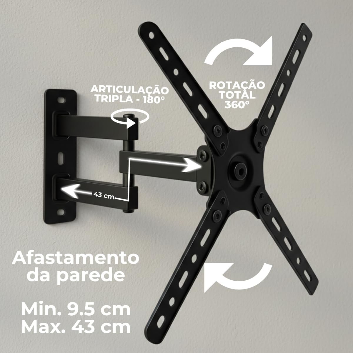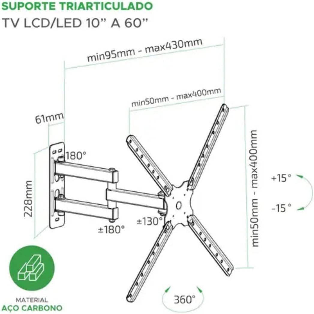 Compatibilidade ampla: Suporte ajustável para TVs e monitores de 10″ a 60″, atendendo modelos de diferentes marcas e padrões VESA.