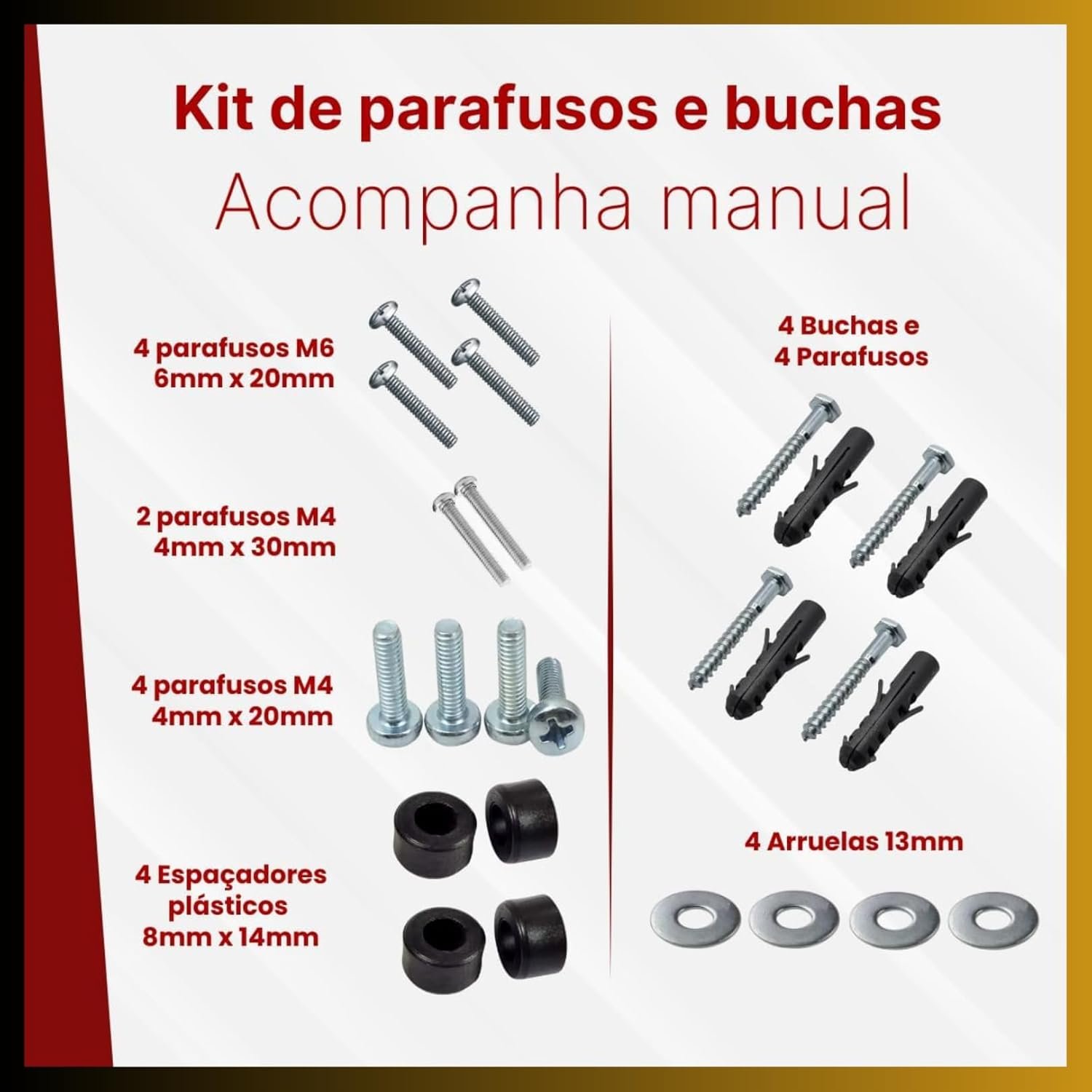 📦 Kit Completo Incluso Acompanha todos os componentes para montagem: 14 parafusos, 4 buchas, 4 arruelas e 4 arruelas de borracha. Pronto para instalar, sem necessidade de comprar nada separadamente! 🧰🧩