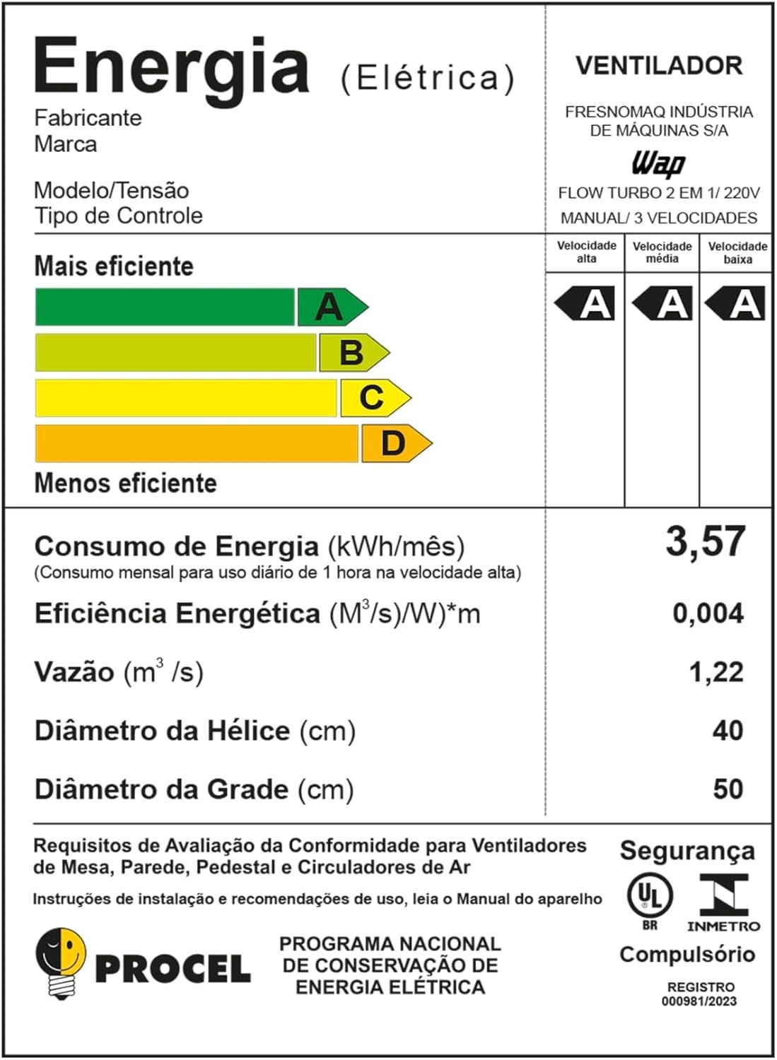 Conta com o selo PROCEL e o Triplo A que garante máxima eficiência energética, proporcionando ventilação potente e mais economia no dia a dia.